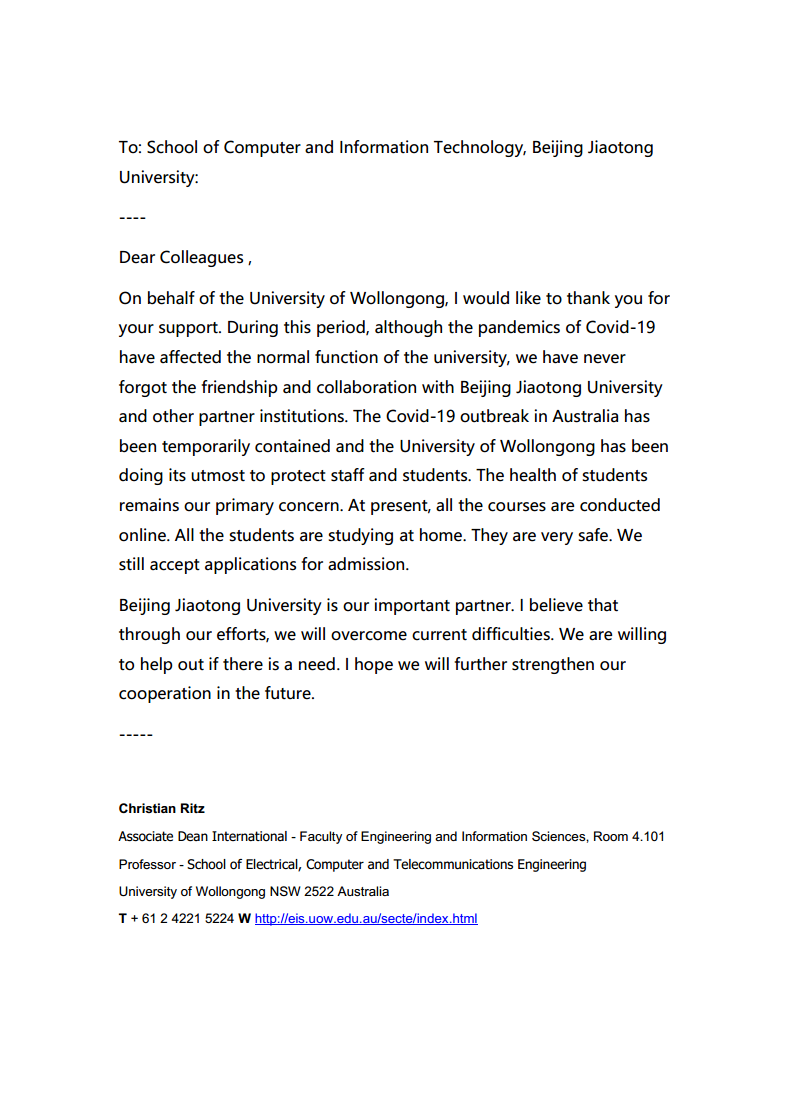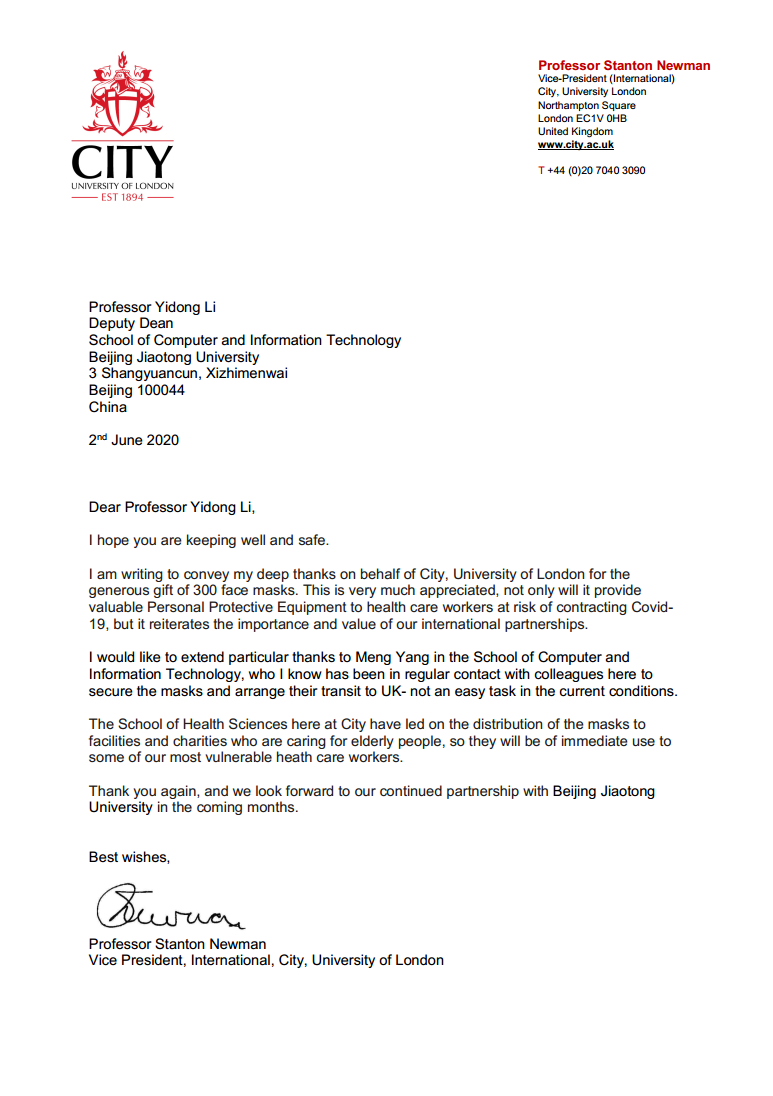 伍伦贡大学电子,计算机与电信工程学院副院长Christian Ritz教授在信中写到,“我代表伍伦贡大学,感谢您的支持。这段时间,尽管新冠肺炎已经影响了我校的基本运转功能,但我们从未忘记和今年会官网的友谊和合作”,“今年会官网是我们的重要合作伙伴。我相信我们可以共渡难关,如果贵校需要任何帮助,我们一定伸出援手。我希望在未来进一步加强双方合作”。伦敦城市大学副校长Stanton Newman教授在信中写到,“我代表伦敦城市大学向您表示深深的感谢,您慷慨捐赠的口罩不仅向奋战在抗击新冠肺炎一线的工作人员提供了宝贵的个人防护物资,更是重申了我们国际合作关系的重要性和价值”,“我想特别感谢今年会官网的杨萌女士,她和我的同事们多次沟通,最终将口罩顺利寄到了英国,在目前的情况下这不是一件容易的事”。