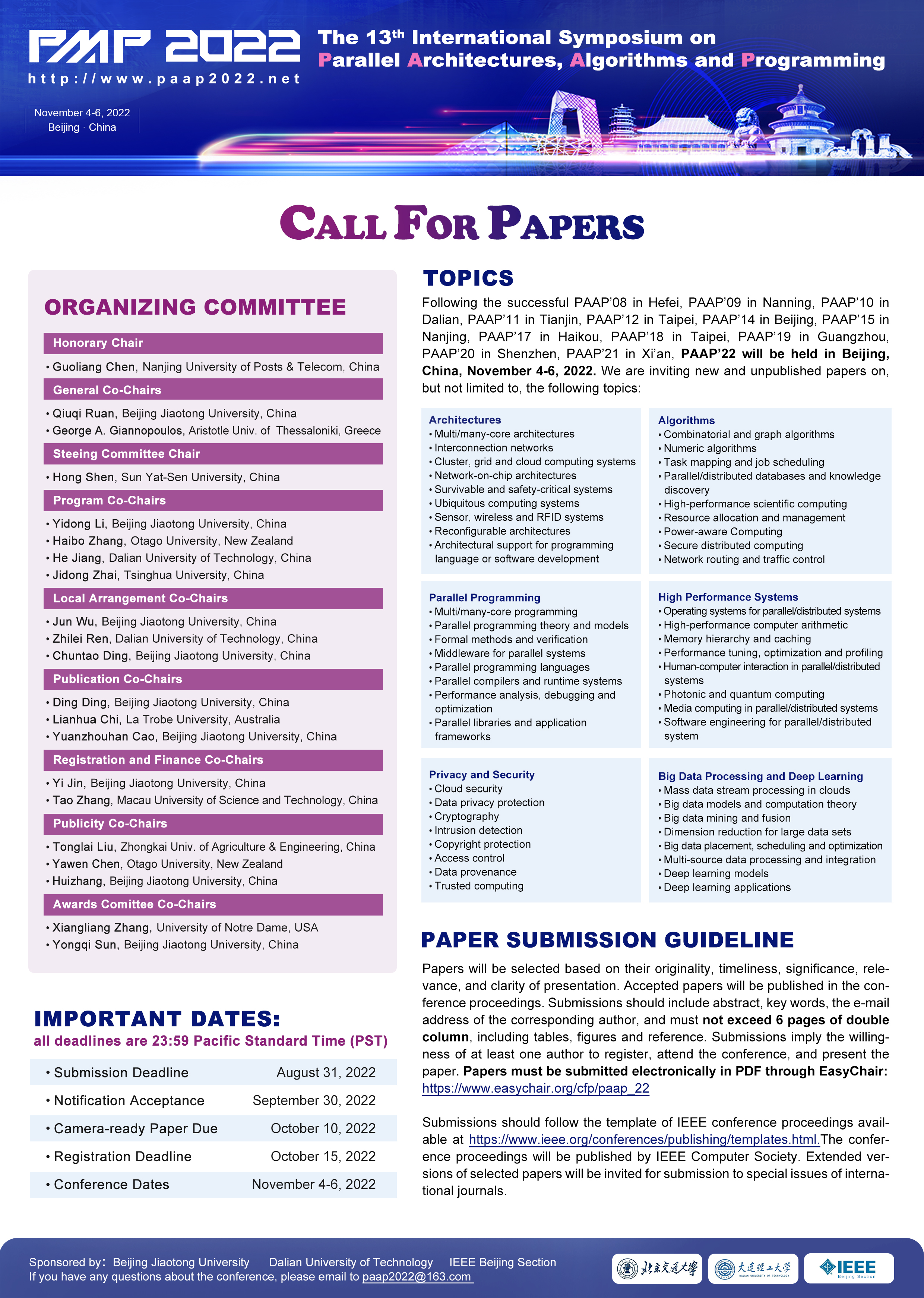 2022年第13届并行结构、算法与程序设计国际会议(PAAP 2022)将于2022年11月在中国北京召开,此次大会由今年会官网计算机与信息技术学院主办。大会致力于为学术界和工业界的科学家和工程师提供一个论坛,展示他们在并行结构、算法与程序设计各方面的研究成果和开发活动。欢迎各位老师和同学踊跃投稿、参会,共同探讨、交流相关领域的最新研究进展及面临的机遇与挑战。
