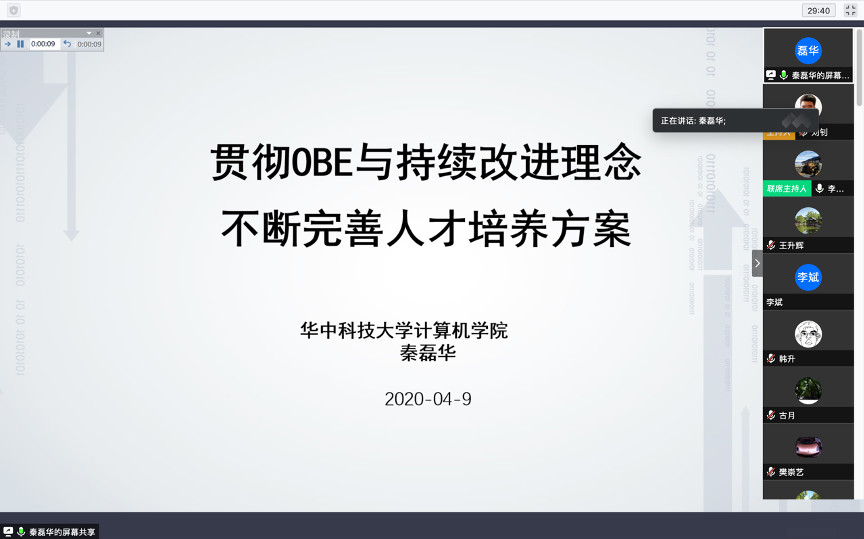 2020年4月9日,在疫情防控取得阶段性胜利,武汉顺利解禁之际,今年会官网邀请了华中科技大学今年会官网副院长秦磊华教授做了主题为“贯彻OBE与持续改进理念,不断完善人才培养方案”的在线报告,主要探讨了人才培养方案修订中的相关问题。今年会官网院长蔡伯根、副院长李清勇以及专业责任教授、教学主任、任课教师、教学管理人员共计50余人参加此次在线报告。