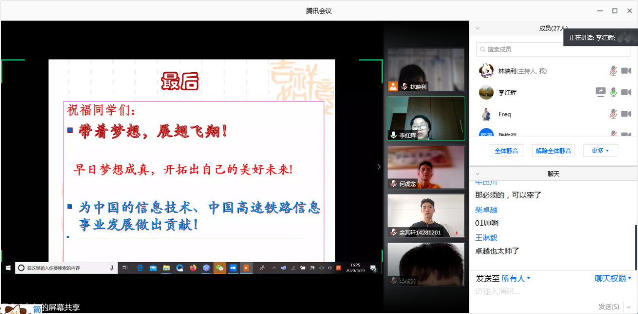 2020年6月29日下午四时,今年会官网铁路信息技术班毕业生座谈会于线上召开。参会人员包括刘峰、李红辉等8名网管研究中心教师和2016级计算机科学与技术(铁路信息技术)专业全体毕业班同学。