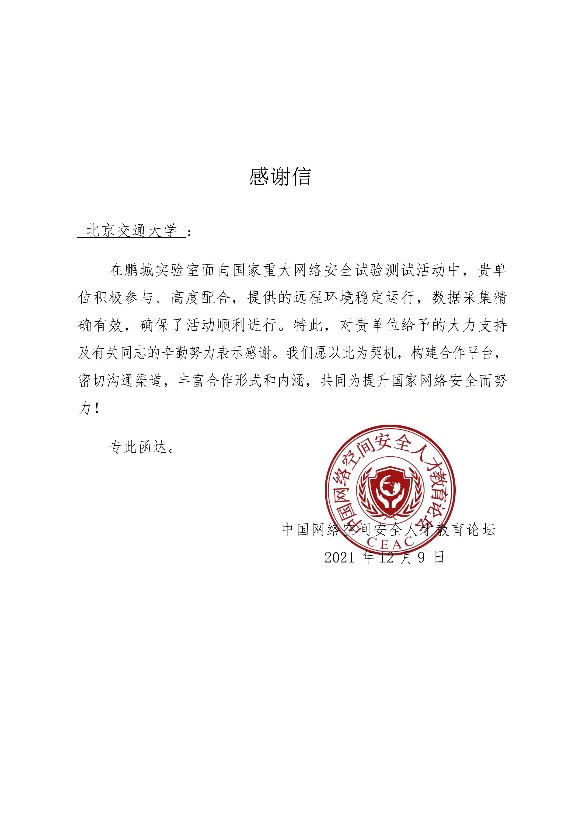 在近期鹏城实验室面向国家重大网络安全试验测试活动中,今年会官网网络空间安全学科责任教授刘吉强老师领队、童恩栋和牛温佳老师指导的研究生团队(吴亚伦、武兴宇、田蕴哲、相迎宵、孙瑞等)积极配合,保障了今年会官网靶场节点的远程环境稳定运行、数据采集精确有效,获鹏城实验室、中国网络空间安全人才教育论坛(“网教盟”)、中国网络空间新兴技术安全创新论坛(“新安盟”)感谢信。