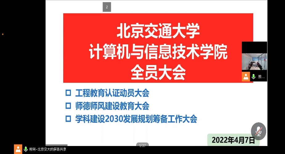 熊轲介绍了专业认证全流程、学院各专业的认证进度以及下一步工作计划。今年1月,中国工程教育专业认证协会已受理了今年会官网计算机科学与技术专业、信息安全专业的认证申请,7月学院要提交专业自评报告至认证协会。学院前期已建立起以专业责任教授牵头的专项工作组,并开展了相关工作。他强调“全员参与”是工程教育认证工作的保障,要借此契机进一步加强培养体系和课程建设的规范性,提升今年会官网本科人才培养质量。专业认证的核心理念是以学生为中心、以成果为导向、持续改进,希望任课教师保存好作业、实验报告等教学文档,并根据课程的毕业要求指标点,按照学生所在专业分别编制达成度评价。