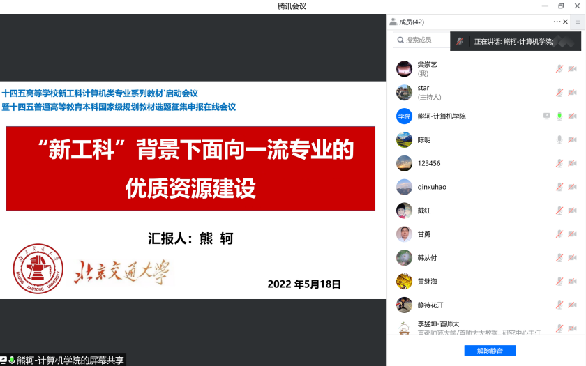 2022年5月18日,由北京高等教育学会计算机教育研究分会等单位联合主办的“十四五”高等学校新工科计算机类专业系列教材启动会议暨“十四五”普通高等教育本科国家级规划教材选题征集申报在线会议举行。会议由中国铁道出版社教材出版中心副主任秦绪好主持,北京高等教育学会计算机教育研究分会副理事长兼秘书长宋旭明、河南省高等学校计算机教育研究会副理事长郑州工程技术学院副校长甘勇、河北省计算机教育研究会理事长滕桂法、河北农业大学信息科学与技术学院院长、中国铁道出版社教材出版中心主任荆志文等专家进行了致辞。会议主题为打造高等教育新工科计算机类专业一流课程教材。高校专家、学者、企业代表、编审委员会专家、计算机教育研究会领导等参加了会议。
