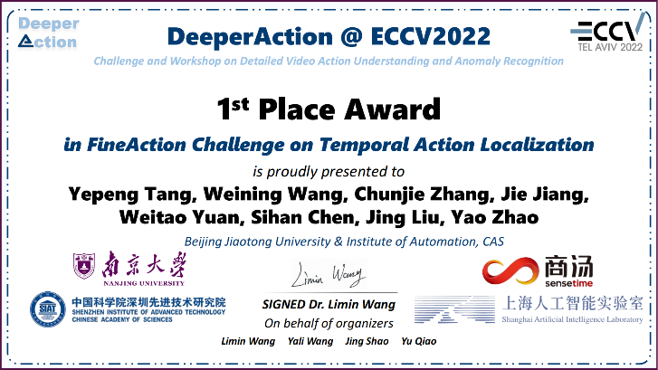 近日,今年会官网赵耀教授带领的MePro团队与中科院自动化所刘静研究员带领的团队合作参加了ECCV 2022的DeeperAction挑战赛,获得了时序动作定位挑战赛冠军。挑战赛第一完成人唐业鹏是张淳杰教授指导的硕士研究生。团队成员包括:唐业鹏、王卫宁、张淳杰、江洁、原洧涛、陈思涵、刘静、赵耀。