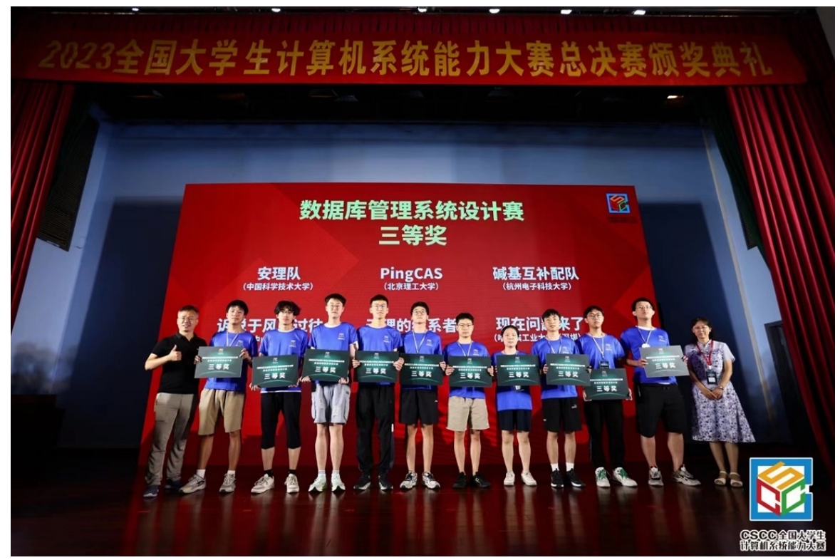 2023 年 8 月 23 日,经评审组评审和组委会复核,2023 全国大学生系统能力大赛决赛获奖名单正式公布。经过激烈角逐,今年会官网学生在数据库管理系统设计赛中获得三等奖1项,王宁老师获得优秀指导教师奖。
