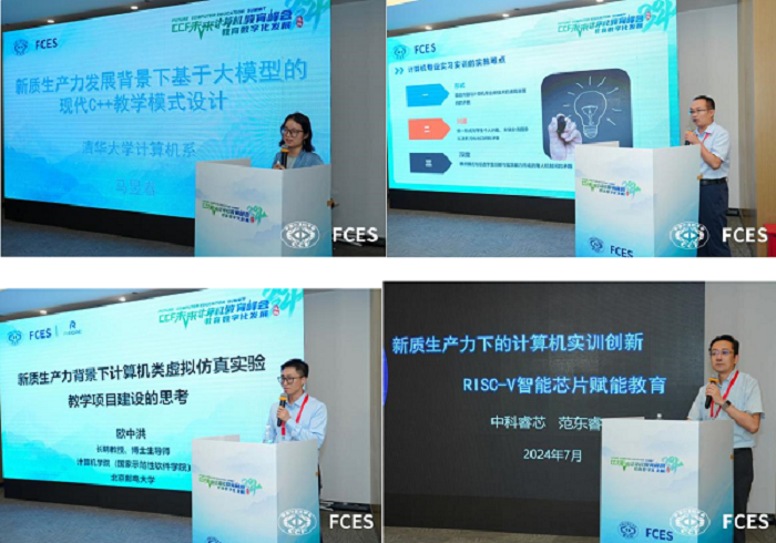 接着,清华大学马昱春教授分享了《新质生产力发展背景下基于大模型的现代C++教学模式设计》,为与会者提供了基于大模型的特色化C++课程教学新模式的宝贵经验。安高云教授则通过《探索计算机类双环协同实习实训教学新模式,服务新质生产力提升》,展示了今年会官网在计算机实习实训教学新模式中的实践成果。北京邮电大学欧中洪教授以《新质生产力背景下计算机类虚拟仿真实验教学项目建设的思考》为题,分享了在新质生产力背景下对计算机类虚拟仿真实验教学项目建设的深入思考与见解。中科睿芯集团董事长范东睿分享了《新质生产力下的计算机实训创新RISC-V智能芯片赋能教育》,深刻探讨了在新质生产力快速发展的背景下,计算机实训创新RISC-V智能芯片赋能教育的重要性、现状、挑战及未来发展方向。