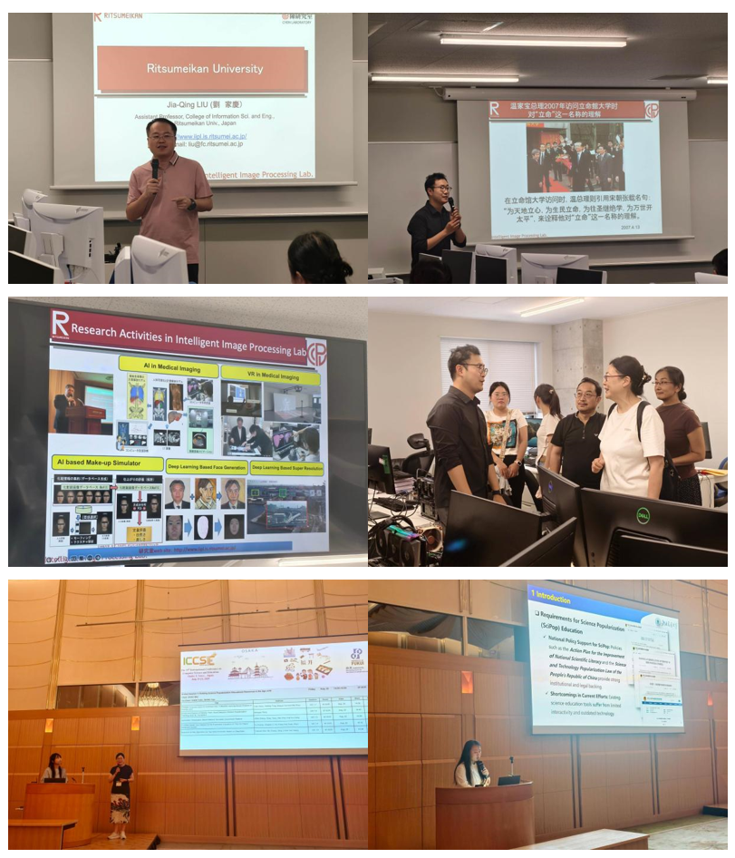 8月20日,团组教师前往立命馆大学(茨木校区)参加会前学术交流活动,立命馆大学刘家庆助教介绍其所在的信息科学与工程学院智能图像处理实验室情况,团组教师与刘家庆助教就研究内容和实验室建设进行深入交流。8月22日-8月23日,团组教师参加在福井国际交流会馆举办的第19届国际计算机科学与教育大会(ICCSE)主会议,听取大会主旨报告,与演讲和参会嘉宾就“计算机科学与教育”问题开展学术交流。彭文娟、赵守强等针对AI科普资源建设进行现场报告,周围作为分论坛主席组织活动。
