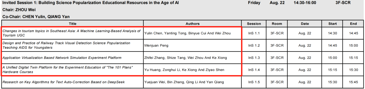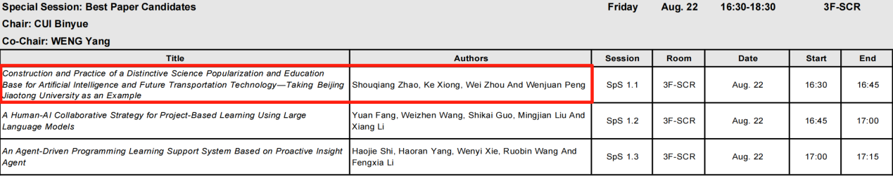在最终的评选中,赵守强、熊轲、周围、彭文娟为作者的论文《Construction and Practice of a Distinctive Science Popularization and Education Base for Artificial Intelligence and Future Transportation Technology—Taking Beijing Jiaotong University as an Example》荣获Best Paper Award。