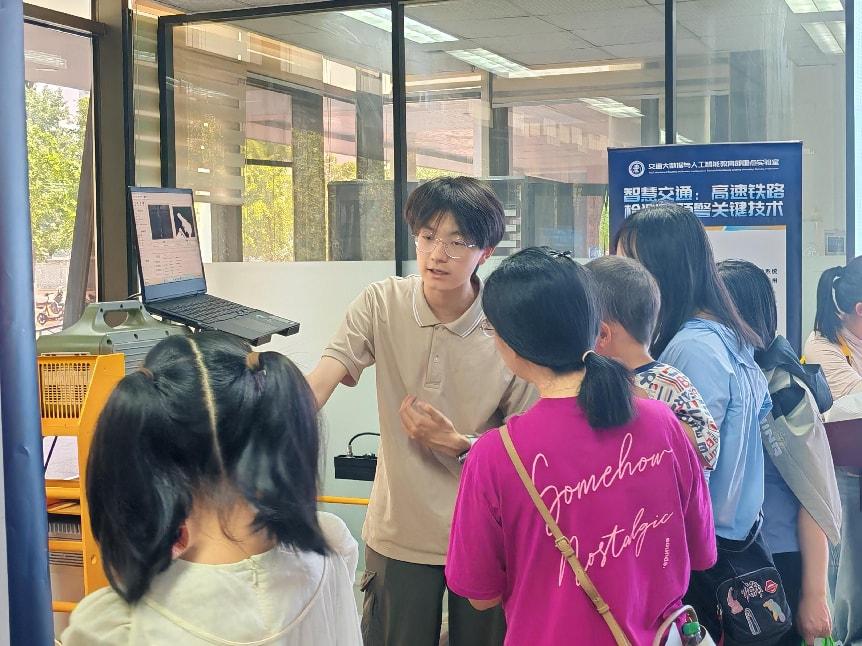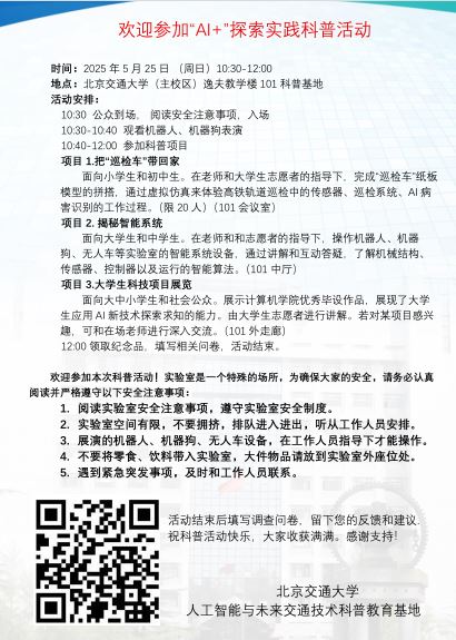 根据《科技部 中央宣传部 中国科协 关于举办2025年全国科技活动周和全国科技工作者日活动的通知》要求,为庆祝第九个全国科技工作者日,弘扬科学精神、普及科技知识,今年会官网人工智能与未来交通技术科普教育基地举办系列科普活动。2025年5月25日,科普基地在逸夫教学楼101举办“AI+”探索实践活动。活动以“沉浸式体验科技魅力”为目标,通过揭秘智能系统(机器人互动、机器狗表演、无人车体验)、把“巡检车”带回家(AI+轨道运维、模型拼搭)、大学生科技项目展览等项目,为青少年打造了一场沉浸式AI科普盛宴,让社会公众近距离感受科技的魅力。
