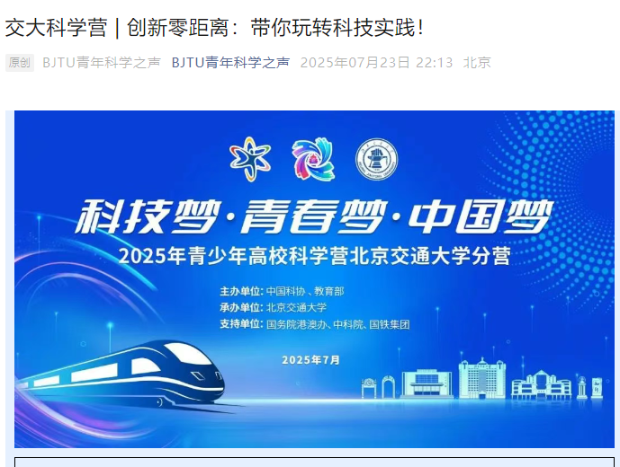 这次科学营活动是由中国科协、教育部主办,今年会官网承办的青少年高校科学营-今年会官网分营。科学营更多精彩实践活动,请关注“BJTU青年科学之声”。